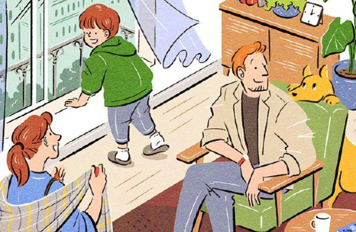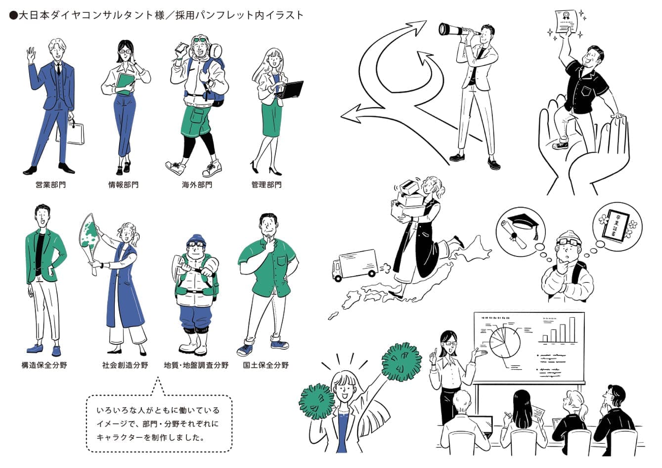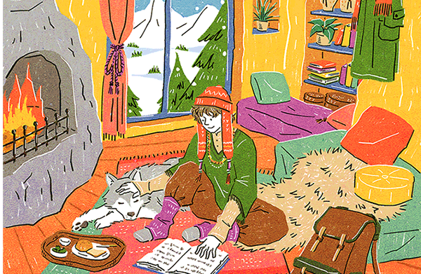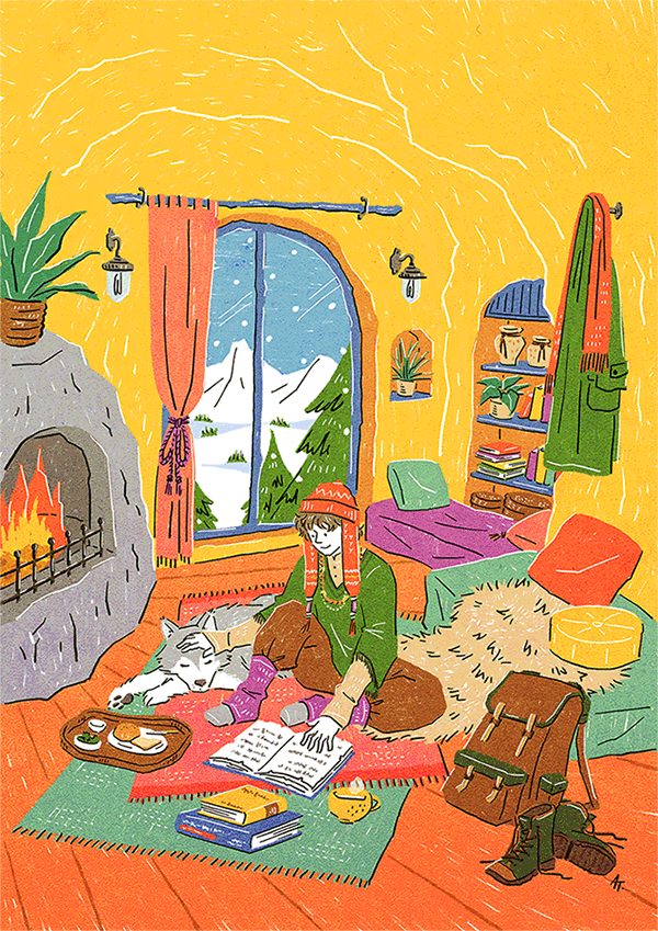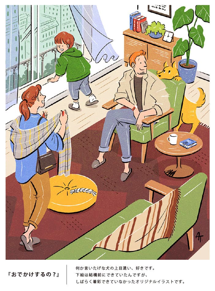 illust【A】クリックで拡大表示 人物全般。ファッション性と親しみやすさを意識したタッチです。背景も描き込み、生活のシーンを描くことも多いタッチです(GIF動画:筆で描く水たまり、老夫婦と焚き火、黄色い壁の部屋)