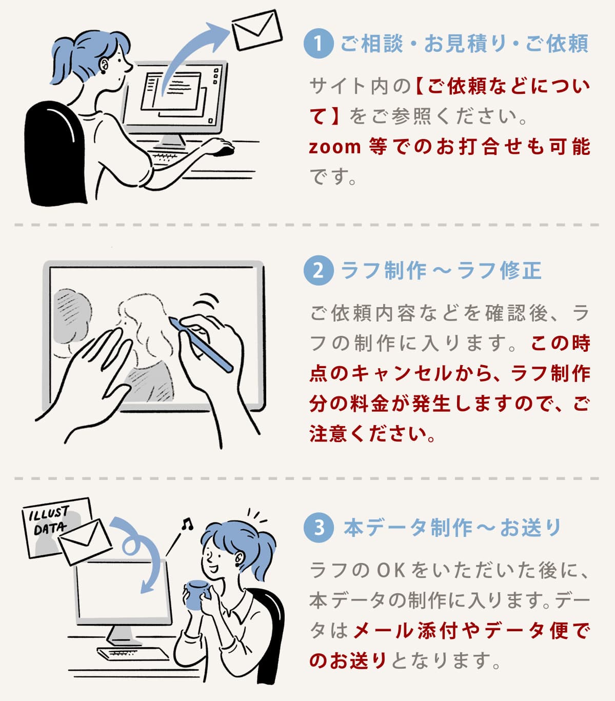 ※納品後、イラストを使用した印刷物等の郵送、またはPDFデータのお送り、webの場合はURLをお知らせいただけますと幸いです。